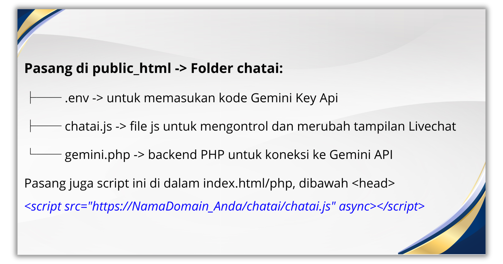 Saat ini banyak website pribadi maupun perusahaan sudah memakai LiveChat Ai untuk mencari informasi secara otomatis. Salah satu pilihan yang bisa digunakan adalah Gemini API (Google AI). Dengan Gemini, kita bisa membuat LiveChat AI yang bisa diakses langsung di website seperti contoh di website inpidi.com.